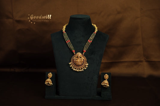 WIDTH: 2.3 INCH WEIGHT: 70 g GOLDEN BEAD CHAIN WITH GODDESS LAKSHMI PENDANT AND GREEN...