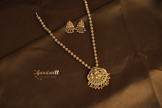 GOLDEN LONG CHAIN IN DEVI DESIGN AND BEADS.