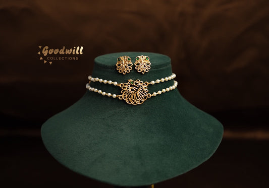 WIDTH: 1.1 INCH WEIGHT: 17.5 g TWO LAYER PEARL BEADED CHOKER SET WITH PEACOCK DESIGN....